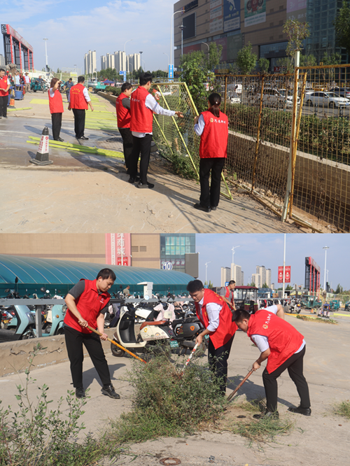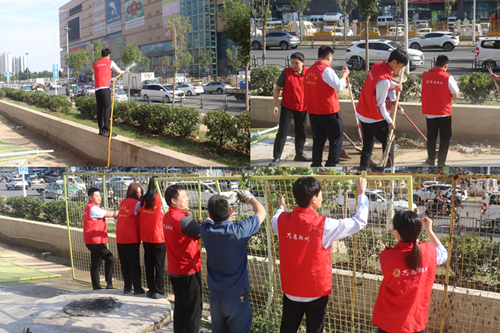 9月24日,新商城運營(yíng)公司黨支部組織開(kāi)展“環(huán)境衛生整治”主題黨日活動(dòng),弘揚“奉獻、友愛(ài)、互助、進(jìn)步”的志愿精神?;顒?dòng)中,黨員志愿者身著(zhù)紅馬甲,協(xié)作拆除商城外圍陳舊圍擋,清理地面雜草垃圾,并拿起水管,給周邊綠化帶中的植物澆水,草叢在灌溉下愈顯生機。